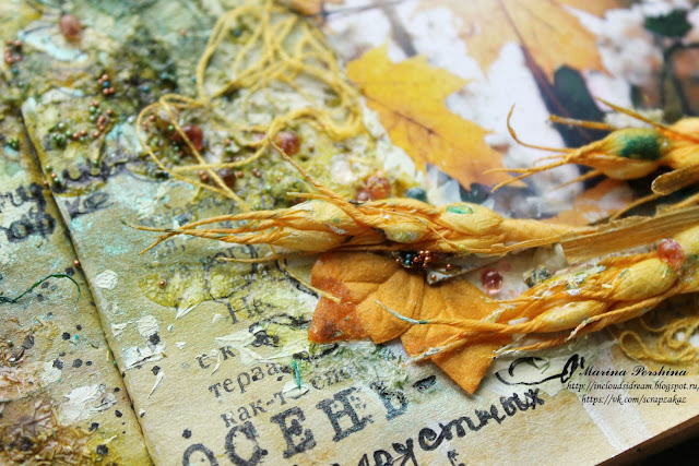 Для фона я использовала текстурную пасту, штампы, нитки, спреи(в т.ч. крепкий кофе)и скелетированные листья. В декоре очень помогли колоски и плоские цветочки. А также мой любимый топпинг.Куда меня мое вдохновение заведет в следующий раз???